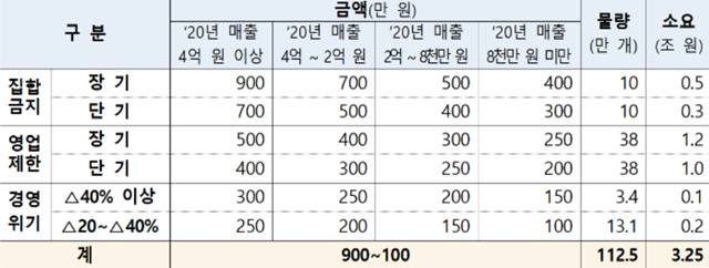 지난해(2020년)의 매출이 4억원 이상이며 집합금지 장기에 해당하는 업소당 소상공인 희망회복자금 지원 최고액은 900만원이 될 예정입니다. 이번에 지급되는 소상공인 5차지원금의 최저액은 100만원인데 지난해 매출이 8,000만원 미만이면서 매출이 40% 미만으로 감소한 경영위기업종에 지원되는 금액이 100만원입니다.